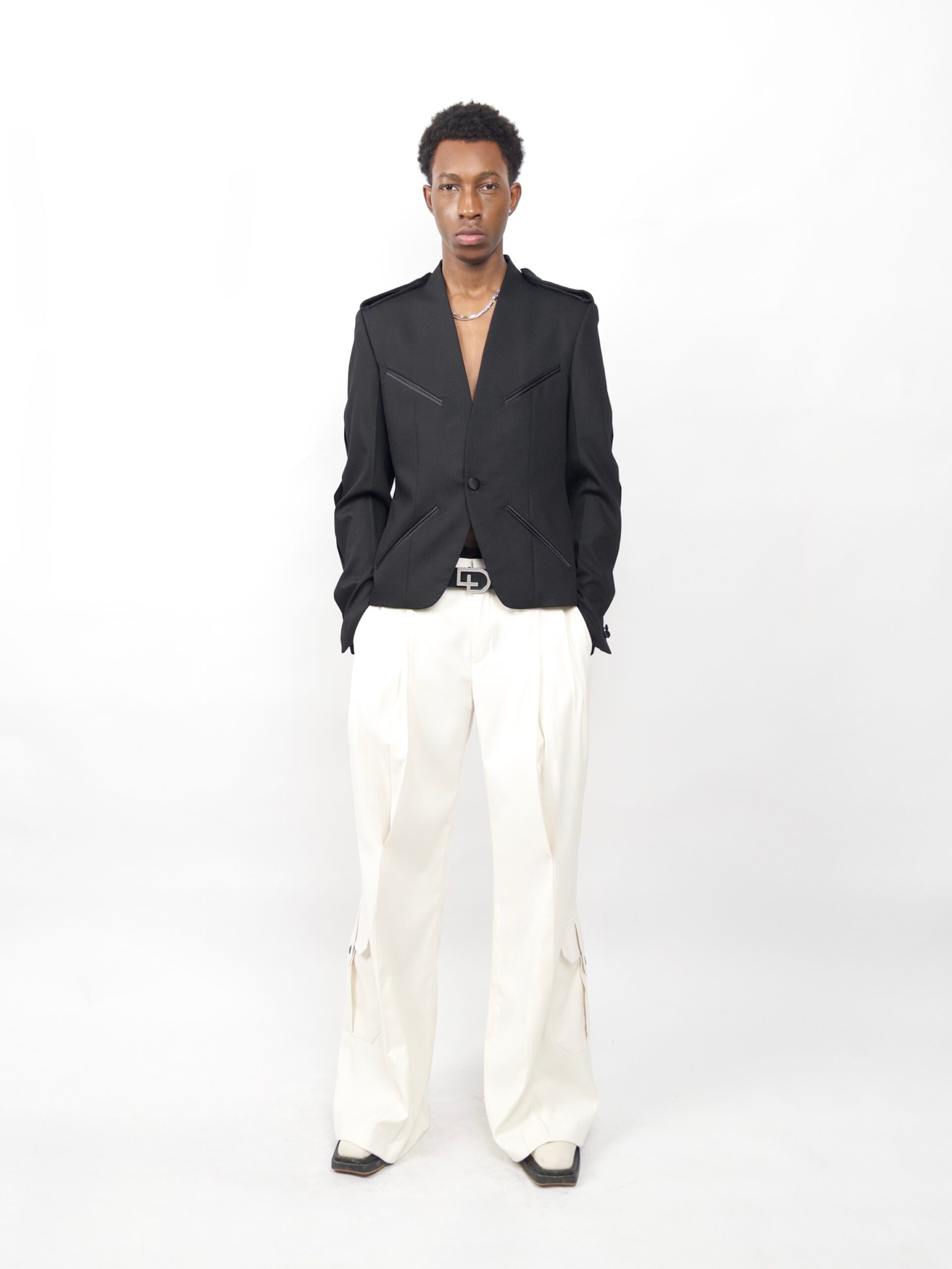 A cropped jacket with mohair epaulettes, lifted collar and sharply angled pockets, inspired by Michael Jackson’s iconic stage style. This piece distills his bold, commanding presence into a minimal, futuristic silhouette — paying homage to the past while looking ahead.